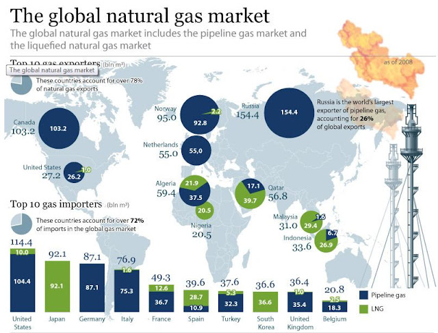 The following map from the Russian news agency Sputnik shows the larger natural gas importers. With blue you can see imports through pipeline networks, and with green imports of liquefied natural gas (LNG) through special ships. The larger exporter of gas through pipelines is Russia and the largest exporter of LNG is Qatar . The map refers to 2010. The circles show the largest exporters of natural gas i.e. Russia , Canada , Norway etc.